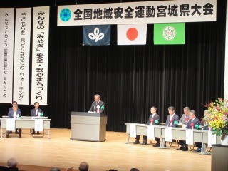 全国地域安全運動は、安全で安心して暮らせるまちづくりを実現するため、地域ぐるみで犯罪の抑止に取り組む運動で、宮城県大会は、宮城県防犯協会連合会、宮城県及び宮城県警察が共同で主催し、県内の自治体や防犯協会等から関係者約400人が参加して開催されました。
