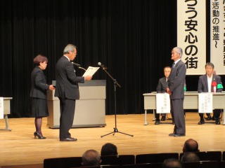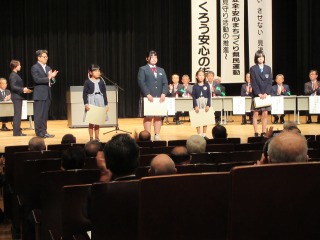 表彰終了後、防犯作文コンクールの小学校の部で最優秀賞を受賞した仙台市立南小泉小学校4年伊藤優理さんが「わたしの好きな町」と題する作文を朗読し、続いて、同じく中学校の部で最優秀賞を受賞した岩沼市立岩沼中学校2年の茨木奈緒さんが「油断が招く危うさ」と題する作文を朗読して、最後に、防犯栄誉金章を受章した栗原地区防犯協会連合会会長の三浦文夫氏が「大会宣言」を読み上げました。