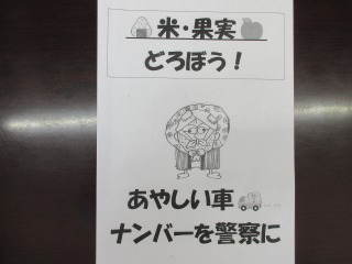 農家が多い鎌先地区では、秋の収穫時期は農作物どろぼう被害が心配されます。6月には鎌先地区の工事現場で、鉄板が盗まれる被害が発生しました。「売れるものは何でも盗む」という風潮を反映した犯罪は、福岡地区にも広がってきているようです。鎌先地区防犯協会では、「米・果実どろぼう警戒」を呼び掛けるオリジナルポスターを50枚作成し、農協をはじめ地域内に配布・掲示しました。