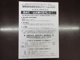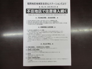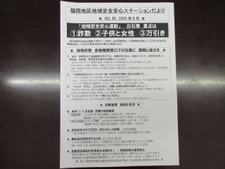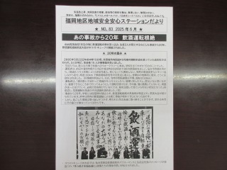 また、鎌先地区防犯協会では、定期的な青色防犯パトロール活動とともに、独自に広報紙「福岡地区地域安全安心ステーションだより」を作成し、1,000部を印刷して地区内各戸に配布・回覧しています。この広報紙は、平成21年から継続して作成しており、警察署との合同会議などにより得たタイムリーな犯罪情報のほか、消防署や金融機関にも働き掛け鮮度の高い情報を得て、地域に根差した、盛りだくさんのテーマを掲載しています。仙台育英高校の生徒の列に飲酒運転の車が突っ込み、生徒3人が死亡した事故を契機に制定された「飲酒運転根絶の日(毎年5月22日)」には、「あの事故から20年 飲酒運転根絶」というテーマで、飲酒運転根絶を訴えました。