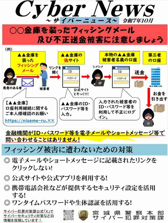 金融機関を装った電子メールやショートメッセージに注意を‼(Cyber News)