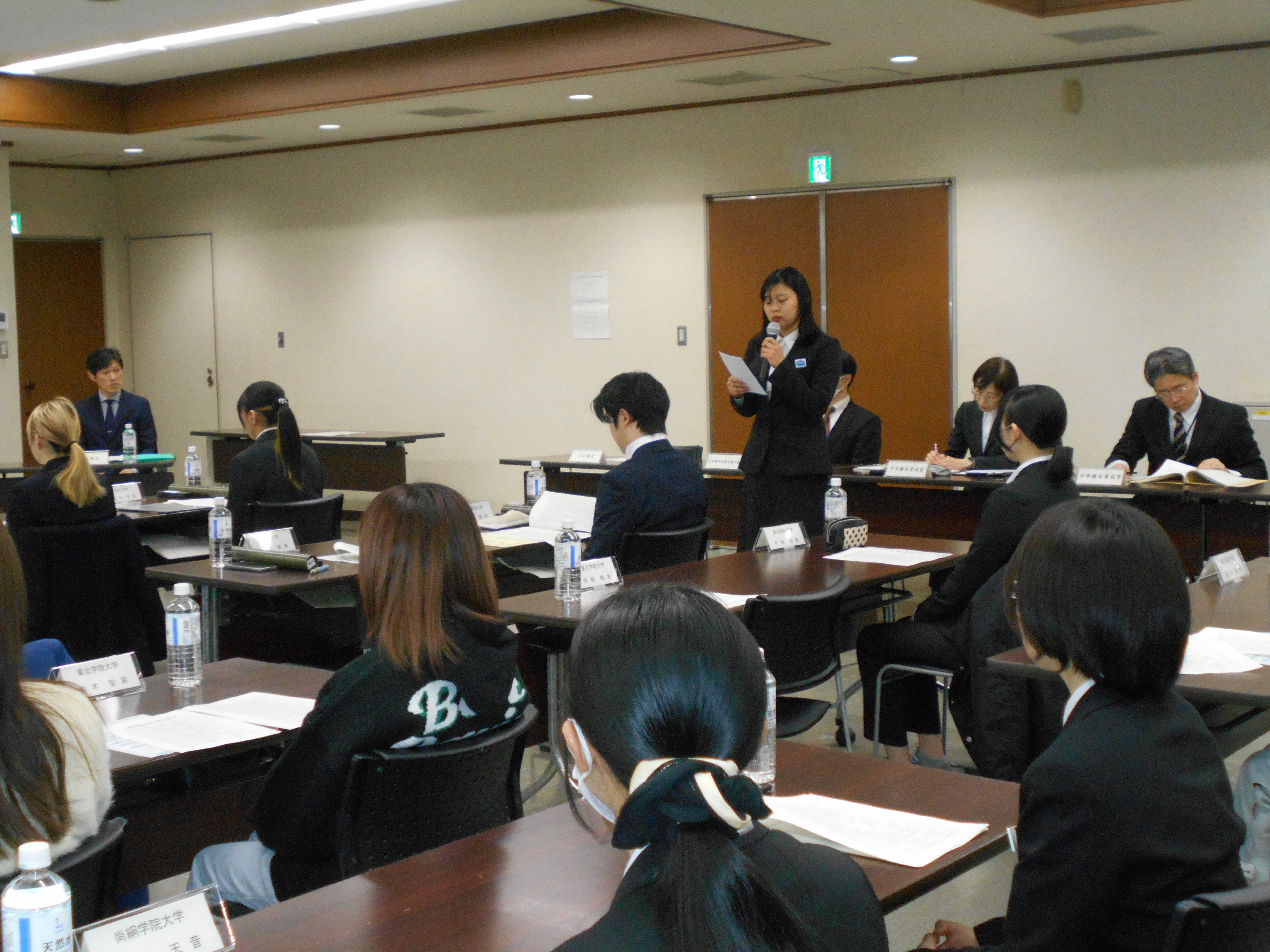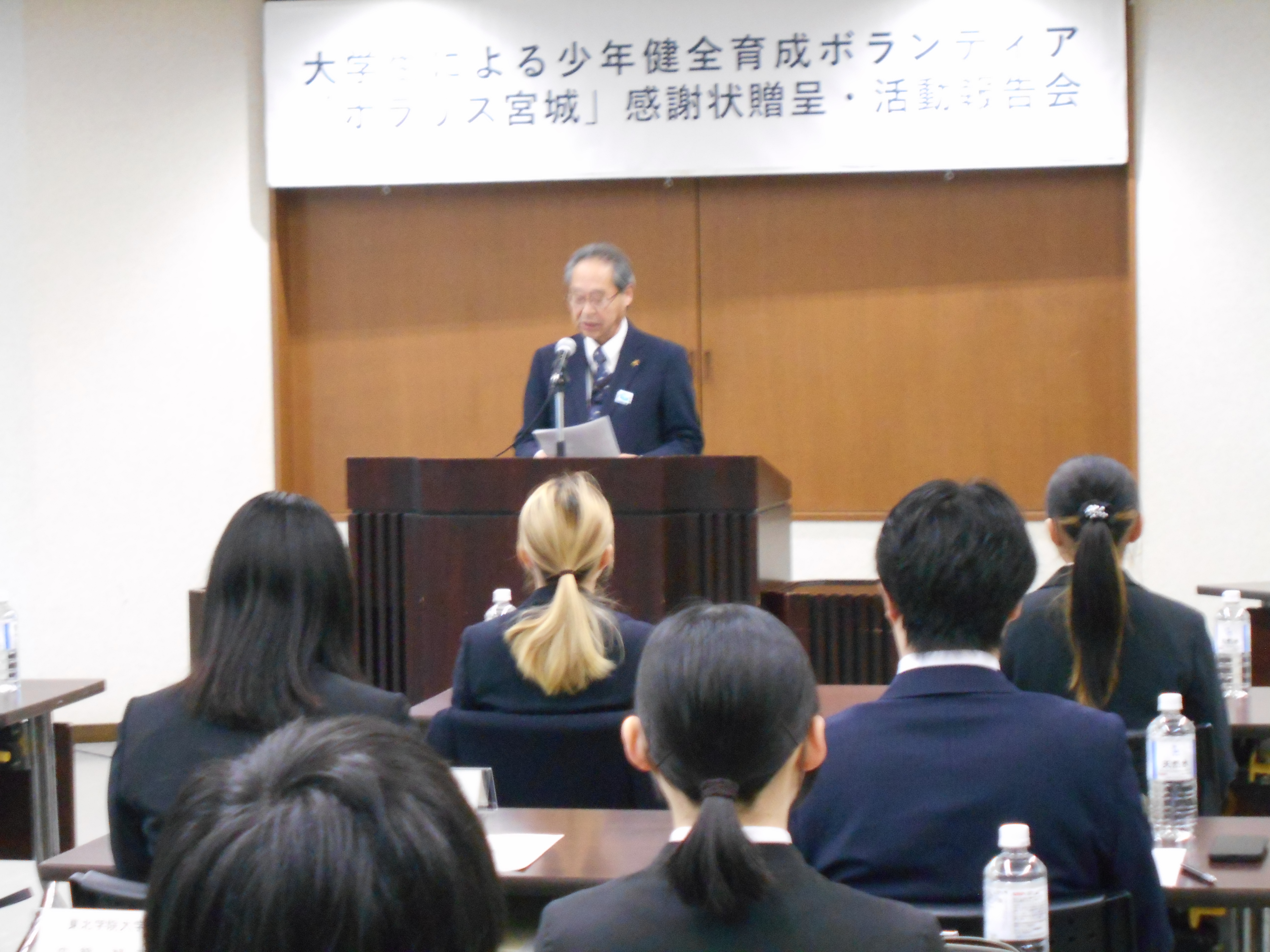 その後、「ポラリス宮城」の大学生2名が、1年間の活動を通して感じた防犯ボランティアの意義ややりがいについて発表しました。その中では、仙台地方裁判所の視察という貴重な体験を通して、犯罪を犯す前の対策の大切さを感じたことや、痴漢等防止キャンペーンなどに参加して、安全な地域社会を作るためには、警察と連携したボランティアや地域住民の活動が大切であると感じたことなどが発表され、とても有意義で、充実した活動であったことが伝わってきました。