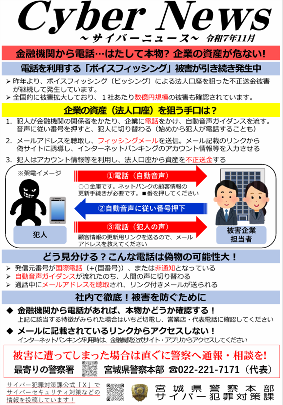 昨年より、法人口座を狙った不正送金被害が継続して発生しています。この詐欺の手口は、犯人が金融機関の関係者をかたり、企業に電話をかけることから始まります。発信元番号が国際電話(+(国番号))や非通知の場合などは十分注意が必要です。手口の特徴を社内で周知し、類似した電話があれば、いちど電話を切り、こちらで金融機関の電話番号を調べてかけ直すという対応を取ることが大切です。