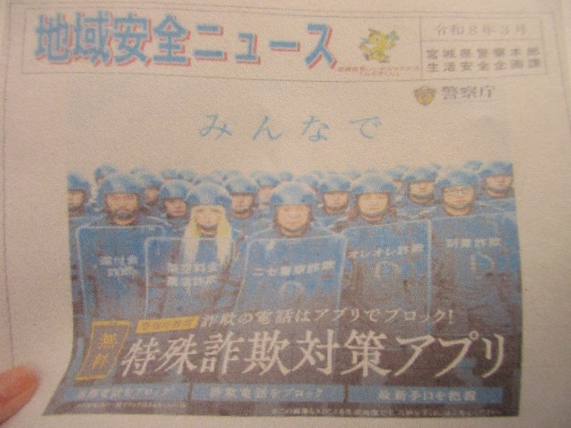 「鹿島台互市」防犯・非行防止キャンペーンは、4月10日(金)に、大崎東部地区防犯協会連合会が中心となり、古川警察署、少年補導員協会及び大崎市役所の協力を得て、総勢22名が参加して実施しました。キャンペーンでは、春の地域安全運動の重点を中心に、自転車の盗難防止に向けたツーロックや特殊詐欺、SNS型投資・ロマンス詐欺被害防止などを呼び掛けました。特に特殊詐欺等の被害防止については、国際電話や詐欺電話をブロックする「警察庁推奨アプリ」の普及促進に向けて、来場者に対してチラシを配布するとともに、その場でアプリをダウンロードしてもらいました。やはり、年齢が高い方の中には携帯電話の操作に不慣れな方も多く、その場で操作方法をアドバイスしながらアプリをダウンロードしてもらう活動は、普及に向けてとても高い効果があると感じました。